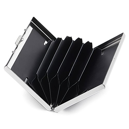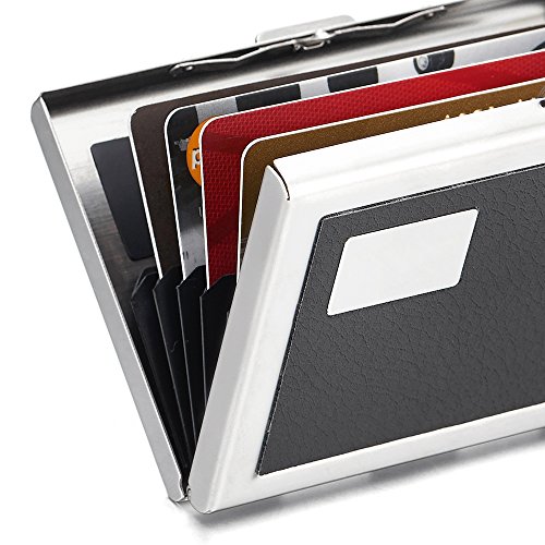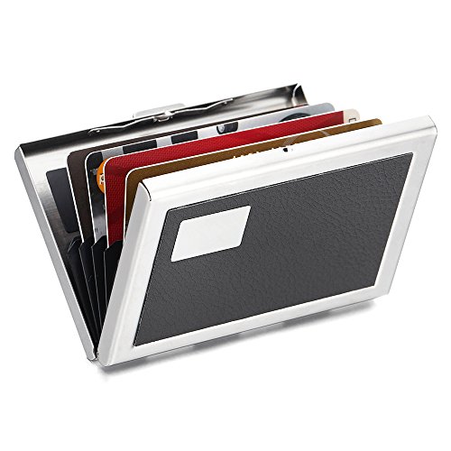 Product Description *Material: Stainless steel leather; Color: Silver black *Measures: 3.78x2.64x0.51inch *6 card slots to allow easy organization of credit cards, business cards and even small cash; RFID blocking *Slim thin. Perfect to slip into your pocket, briefcase or handbags *Timeless style for both men and women