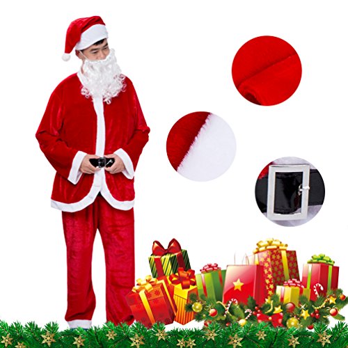 -. Feature : Christmas Clothes' SIZE: One Size(M to L) ,free size fit more!!!,you can check the below exact measurements about Xmas Suit. / Santa Suit's Materials:Velvet. The material is very comfortable to wear. It is breathable and cozy. Even you can wear it many days will not out of shape. This Santa suit you'll be able to wear it Christmas after Christmas. / Christmas gift for women:Christmas Costumes For men Include:Jacket+pant+Hat+Beard +belt(adjustable) / Red Flannel Santa Suit,Friends, family, and the kid inside everyone will enjoy a visit ; / Santa clause outfit:we give your best service for you.So If you are not satisfied with items from Zulves, you will get full money refund with no-asked questions. Enjoy a smooth & frustration free experience. Just order yours now!