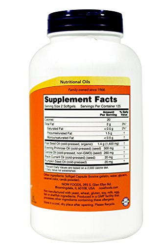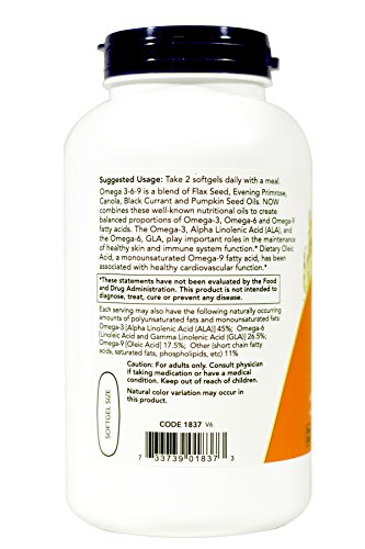 Omega 3-6-9 by Now Foods 250 Softgel While small percentages of essential fatty acids can be obtained from food the majority of the population tends to consume far more of the saturated bad fats than essential good fats (Omega-3 and -6). NOW Omega 3-6-9 is an ideally balanced full-spectrum source of these three good fats. By utilizing high potency Omega-3 from flaxseed and canola Omega-6 from primrose and black currant and Omega-9 (or Oleic acid a non-essential fatty acid) from Canola and Flax our formula helps correct this common imbalance while minimizing any chance of reoccurring reverse imbalances.Feature