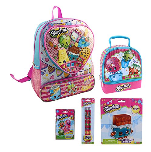 -. Feature : Take all the fun shopping adventures of Shopkins with you to school this year with this Shopkins Ultimate Back to School Set! / This Ultimate Back to School Set Includes: Shopkins 14 inch Backpack - Hearts, Shopkins Dome Lunch Bag, Shopkins Giant Scented Eraser (styles and scents vary), Shopkins Collectible Eraser Pack (variable styles), and Shopkins 4 Pack of Pencils! / Backpack: Featuring Shopkins, 3 Zippered Compartments, 2 Mesh Side Pockets, Adjustable Shoulder Straps, Highly Visible Reflective Strips / Lunch Tote: Insulating qualities to help keep food cool for longer, Wipeable lining for easy cleaning, Carry handle for easy transportation and name tag, Traditional shape with generous space for lunch and snacks / Make back to school fun and exciting with this hard to find Ultimate Back to School set! Click on the Ultimate Back to School Sets link above to see similar back to school items available for sale!