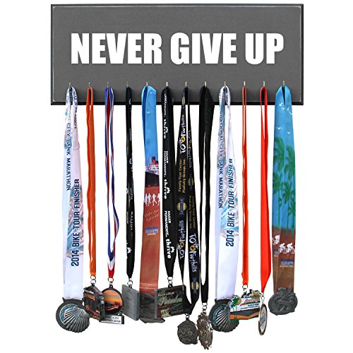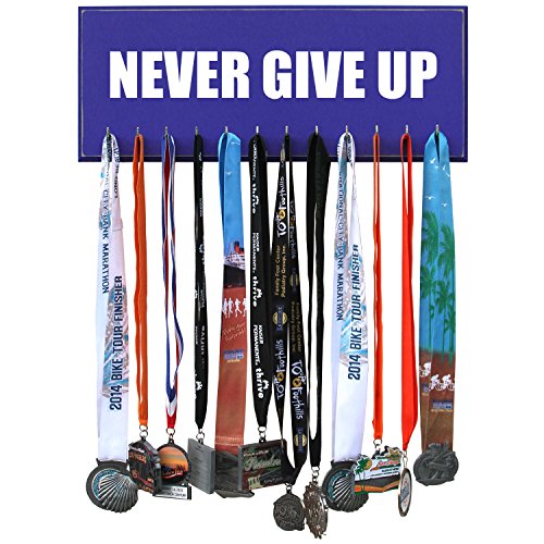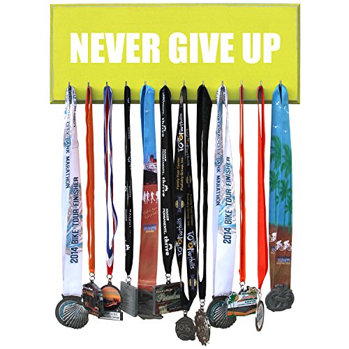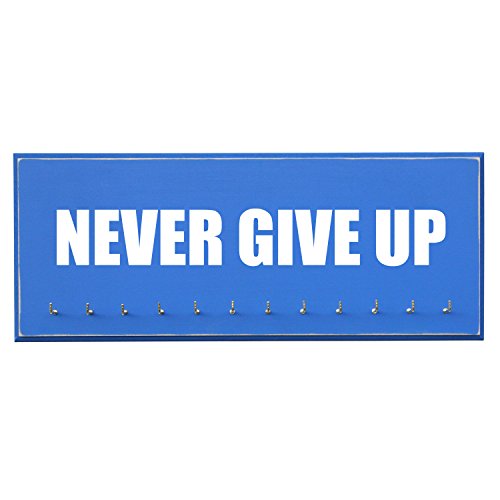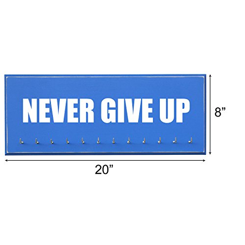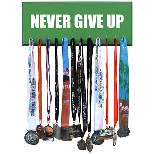 -. Binding : Misc. -. Brand : RunRilla -. Feature : Handmade in the USA. 20 inches X 8 inches X 3/4 MDF Wood. / 12 hooks to show off your medals. / Assembly of hooks are required. Hooks are removed to prevent damage during shipment. Holes are pre-drilled so the hooks can easily be installed. / Hand painted, beveled and distressed edge, premium vinyl lettering and 2 sawtooth hangers. / Color unevenness and distress appearance may vary from the picture. -. Label : Runrilla -. Manufacturer : Runrilla -. MPN : 3085 -. PartNumber : 3085 -. ProductGroup : Sports -. ProductTypeName : SPORTING_GOODS -. Publisher : Runrilla -. Studio : Runrilla -. Title : Medal Hanger, Display, Holder - NEVER GIVE UP