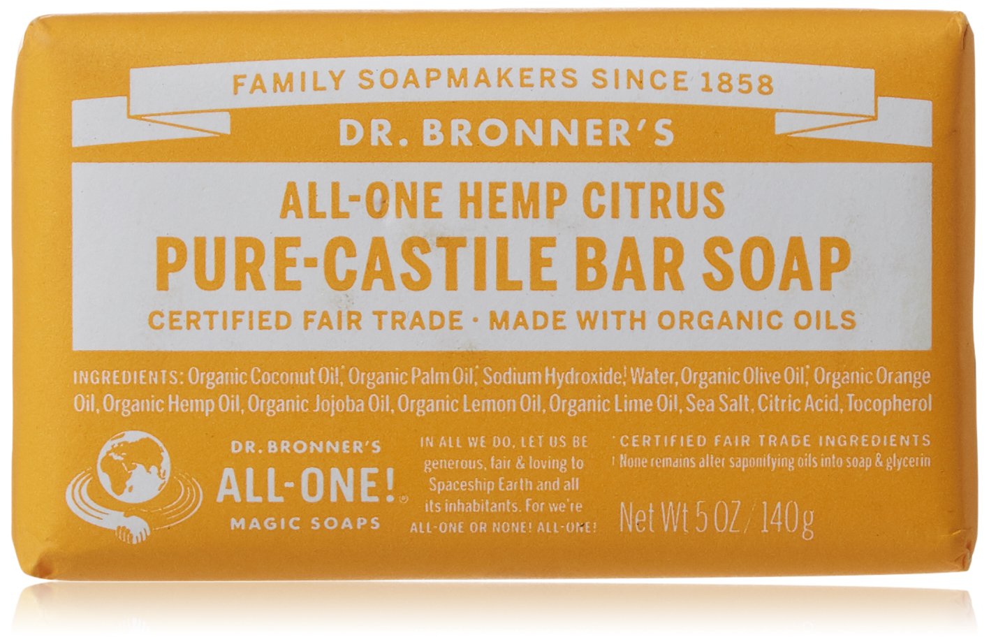 「マジックソープ バー シトラスオレンジ 140g (正規輸入品)」は、米国Dr.ブロナー社製の洗顔石鹸です。オリーブ油、ヤシ油で作ったベースに、ヘンプ油とホホバ油を絶妙にブレンド。顔はもちろん、体も洗え、さらにメイクまで落とすのにお肌にはマイルドな使い心地です。