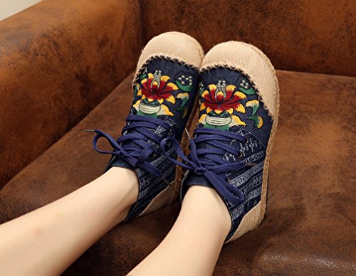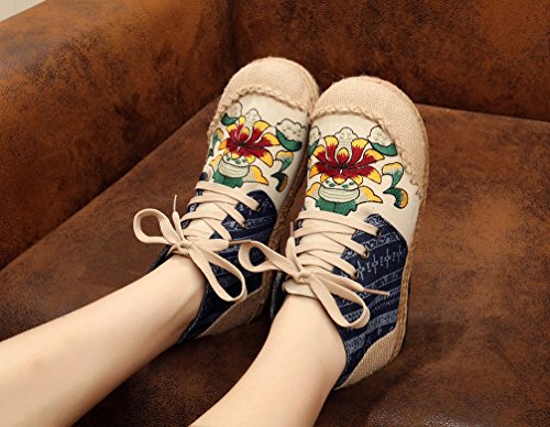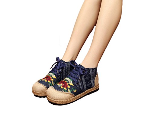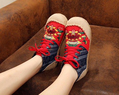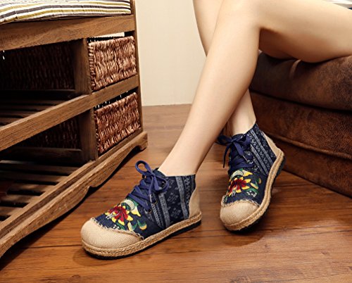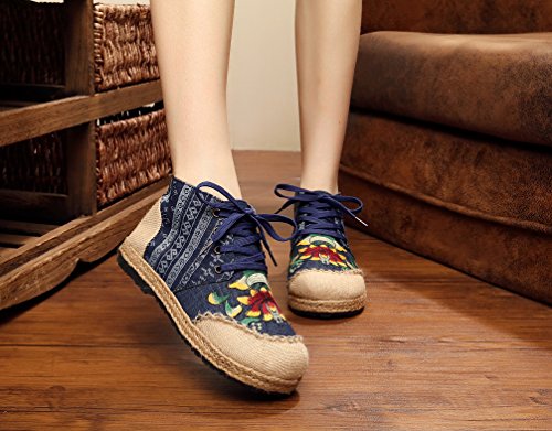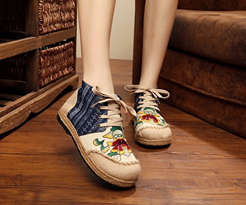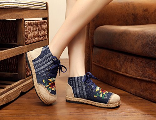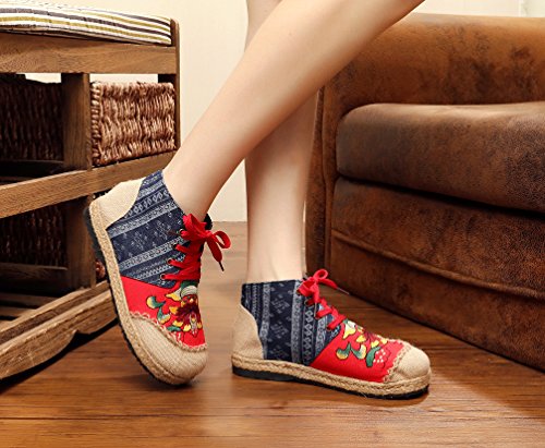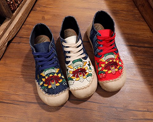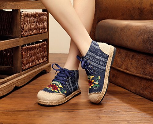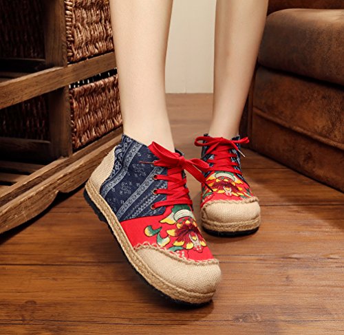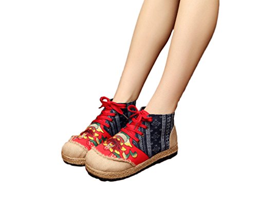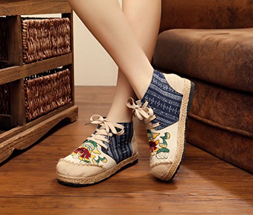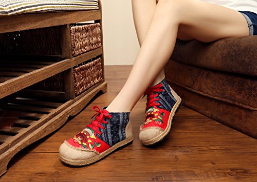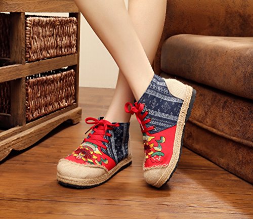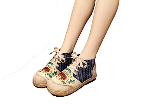 Product Description Gored pattern and design is colorful, fresh and bright, which can easily attract lots of people. Pattern of lotus is full of national customs. It can show your female elegant and quiet. High Top is designed for covering completely your feet in order to protect your ankle and feet from hurting in your daily life. The design of Lace up is adjustable for you to change its loose according your fact and increase your glamour. The upper and inner martial are made from Linen Fabric and breathable Cotton, with breathable, sweaty, and deodorizing function. Using Colorful weaving process, the shoes combine with ethnic elements, bright and fashion. Cloth shoes material used in fabric. They are breathable, casual, comfort, environmental protection, antiperspirant, deodorant, health, moisture absorption, light and so on, let you feel comfortable and leisure. Fashion linen embroidered shoes have been famous for its fashionable, beautiful and dignified.