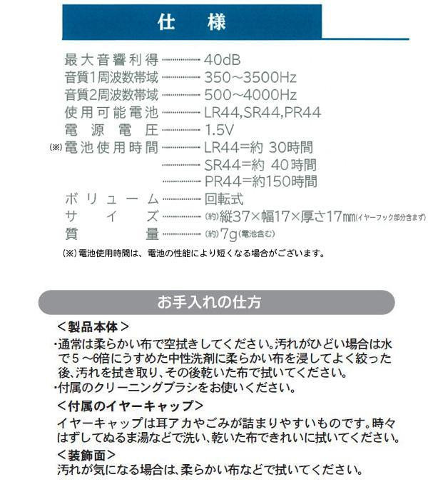 | 付属品 | ●ボタン電池(LR44)×3 ●イヤーキャップ×4(大・中・小・特小×各1) ●クリーニングブラシ ●ジュエリーポーチ ●取扱説明書兼保証書(保証期間:1年間) |