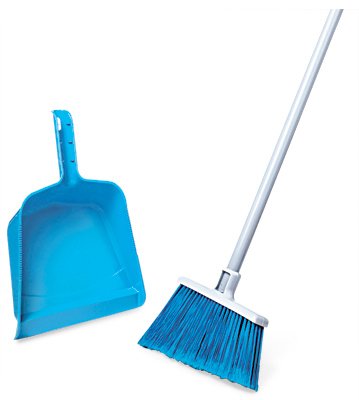 - Feature : Oversized 12-inch sweep for large area cleaning / Angle cut provides access into corners / Large-sized, modern-line dust pan with snap-fit handle to store on brooms / 48-Inch powder coated steel handle / Hang up feature on end of handle for convenient storage