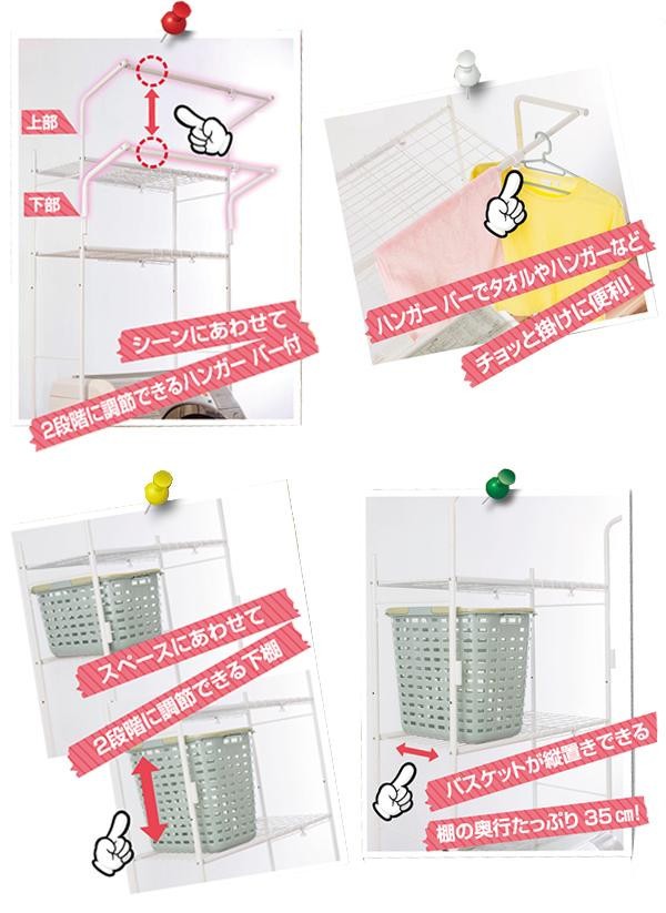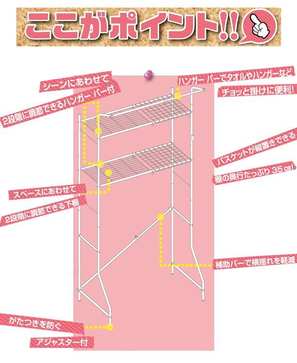 | 幅60~99cmに調節可能で様々な洗濯機に適応します。ハンガーバーはタオルやハンガーなど、ちょっと掛けに便利!!シーンに合わせて2段階に調節できます。棚の奥行たっぷり35cm。下段はスペースに合わせて高さが2段階調節出来ます。がたつきを防ぐアジャスター付き。また補助バーで横揺れを軽減します。 |