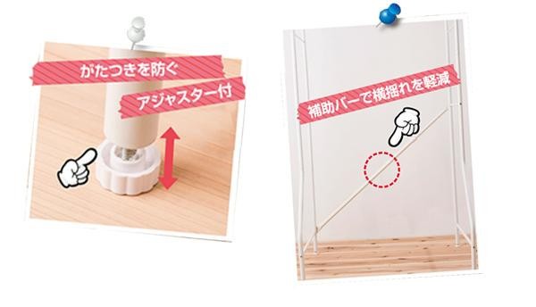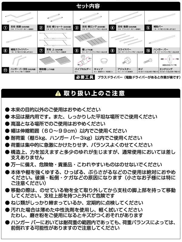 | 素材・材質 | 支柱・棚・バー:スチール(エボキシ樹脂紛体塗装) 樹脂部分:ポリプロピレン・ABS ネジ:スチール(メッキ加工) |