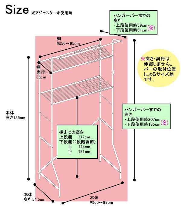 | サイズ | 本体サイズ:幅600~990×奥行545×高さ1850mm(ハンガーバー寸法は含まない) 個装サイズ:40×8×98cm |