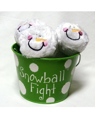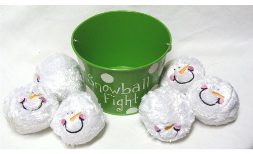 Snowball Fight! 6 Plush Snowmen Balls and a Green Tin Labeled "Snowball Fight" - Indoor Play Ball Toy. Tin is 4.5" Tall (not including the handle) and width at the top is 6" Diameter. Indoor Play.