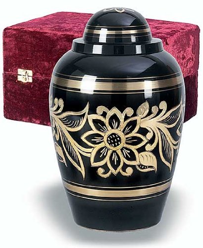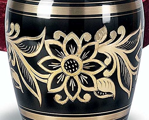 Our Ebony Bouquet Urn, made of genuine brass, honors your loved one with classic elegance. This work of art displays beautiful, classic florals, entirely hand engraved. Skillfully carved one at a time, each urn is a unique work of art. The screw-on top is threaded and secure.??