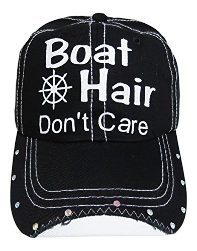 -. Binding : Apparel -. Brand : Spirit Caps -. ClothingSize : One Size Fits Most -. Color : Black -. Department : womens -. Feature : Adjustable Buckle Back/100% Cotton / Glitter Letter "Boat Hair Don't Care" Design / Vintage Style (Torn Look) Black Baseball Cap with AB Rhinestones on the bill of the Cap! / Super Cute! / Ships from the USA! -. ProductGroup : Apparel -. ProductTypeName : HAT -. Size : One Size Fits Most -. Title : Glitter Boat Hair Don't Care Black Baseball Cap W/Rhinestones