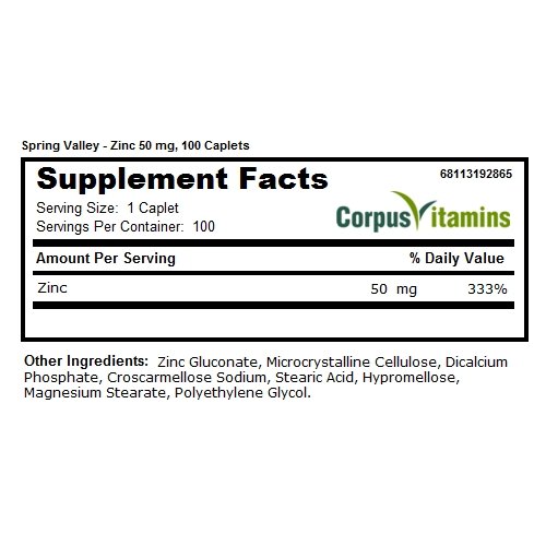 -. Binding : Health and Beauty -. Brand : SP.R.Ing Valley -. EAN : 0681131928656 -. Feature : Micro-thin Coated Caplets for Easy Swallowing. / Recommended as part of a daily regimen for women's health, winter wellness, and immunity. / Helps improve sense of taste, particularly in the elderly. / Promotes antioxidant activity; contributes to a healthy pregnancy. / 100 Caplets. -. IsAdultProduct : 0 -. Label : SP.R.Ing Valley -. Manufacturer : SP.R.Ing Valley -. ProductGroup : Health and Beauty -. ProductTypeName : HEALTH_PERSONAL_CARE -. Publisher : SP.R.Ing Valley -. Studio : SP.R.Ing Valley -. Title : SP.R.Ing Valley Zinc Supplement -. UPC : 681131928656