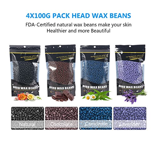 - 4 Flavors Hard Wax Beans: Natural wax Ingredients Chamomile, lavender, chocolate, original flavor. Can remove your body hair, like armpit, bikini area, eyebrows, beard and other hair which you unwant , from stubborn coarse hair to the finest fuzz, leaving your skin soft and glowing