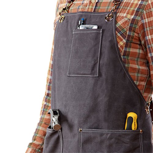 - KEEP YOUR TOOLS HANDY: Don’t want to walk around with a crammed tool belt around your waist anymore? Boasting 2 double stitched pockets in the front and a third, special phone pocket for added functionality, this waxed canvas work bib apron allows you to keep your tools handy, without sacrificing your look.