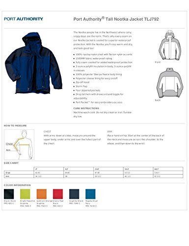 Studio : Port Authority Publisher : Port Authority Binding : Apparel Product Description Style #: TLJ792 The Nootka people live in the Northwest where rainy soggy days are the norm. That's why our Nootka Jacket is fully seam-sealed for superior waterproof protection. With the Nootka you'll stay warm and dry and look good too! 100% ripstop nylon shell with Taslan nylon accents 1500MM fabric waterproof rating Fully seam-sealed for added waterproof protection 2-ounce polyfill insulation in body 3-ounce polyfill in sleeves 100% polyester Sherpa fleece body lining Polyester sleeve lining for easy on/off Zip-off hood Storm flap Four zippered pockets Drop tail hem with drawcord and toggle for adjustability Port Pocket for easy embroidery access 0