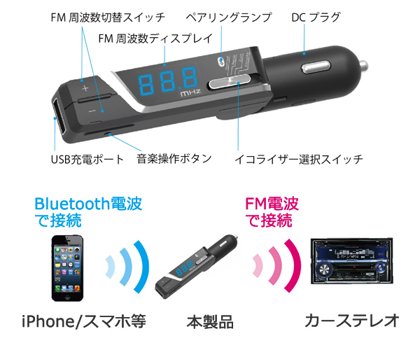 ●Bluetooth対応のスマートフォン/iPhoneの音楽やワンセグ音声をワイヤレスで受信、カーステレオから聴くことができます