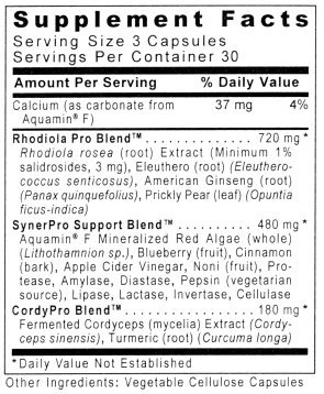 Adaptogen-R3 TM offers a premier, full spectrum formula that supports the body’s adaptogenic response and promotes the body’s ability to manage physical and mental stress. This product features several key, nutraceutical blends. Rhodiola ProBlend TM contains an adaptogenic support blend with the famous botanicals: Rhodiola Rosea root, Eleuthero root, Opuntia and Maca. SynerPro Support Blend TM and CordyPro Blend TM supply a broad range of biocompatible botanical agents which offers a complex phytochemical profile for additional nutritional support .