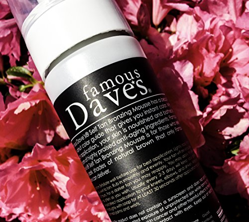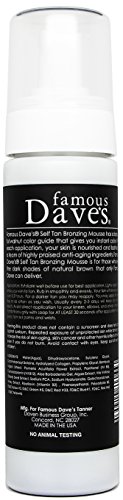 SUNLESS TANNING MOUSSE : Famous Dave's® Self Tan Bronzing Mousse is a darker, ever-so-natural silky and luxurious alternative to a lotion. With each application, your skin is nourished and bathed in a team of highly praised anti-aging ingredients. Its beautiful walnut color guide gives you instant color, while you wait for your enviable golden tan to develop - and natural looking enough to act as a bronzer!