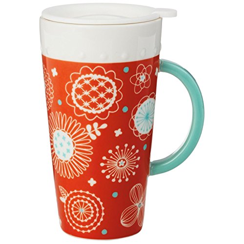 Our bright orange travel mug featuring fanciful floral illustrations is sure to brighten your morning commute. The removable metal infuser basket for bagged or loose tea is designed to brew perfectly while keeping your drink warm. This mug with lid is designed to fit in car cup holder.