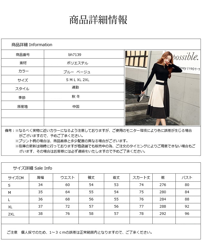 ■素材:ボリエステル■カラー:ブルー ベージュ■サイズ(cm):S肩幅34ウエスト60袖丈54着丈53裾276スカート丈74バスト80M肩幅35ウエスト64袖丈55着丈54裾280スカート丈75バスト84L肩幅36ウエスト68袖丈56着丈55裾284スカート丈76バスト88XL肩幅37ウエスト72袖丈57着丈56裾288スカート丈77バスト922XL肩幅38ウエスト76袖丈58着丈57裾292スカート丈78バスト96