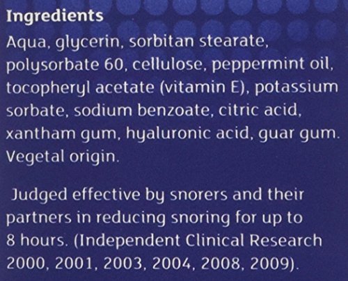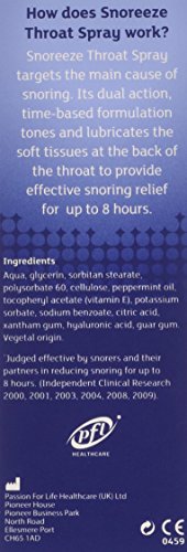 -. Binding : Health and Beauty -. Brand : Snoreeze -. EAN : 5052311988435 -. Feature : Designed to help reduce or eliminate snoring / Works by actively lubricating the soft tissues at the back of the throat / Uses a blend of micro-encasulated natural ingredients / 50 servings per bottle -. IsAdultProduct : 0 -. Label : Snoreeze -. Manufacturer : Snoreeze -. Model : W2031 -. MPN : W2031 -. PackageQuantity : 1 -. PartNumber : W2031 -. ProductGroup : Health and Beauty -. ProductTypeName : HEALTH_PERSONAL_CARE -. Publisher : Snoreeze -. Studio : Snoreeze -. Title : Snoreeze Throat Spray 23.5ml
