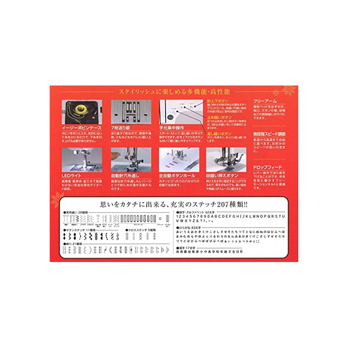 부속품:하드 케이스,풋 콘트롤러,와이드 테이블,바늘#14×3개,bobbin×3,사팽이 억제하고, 입식실 세워 막대기,re《파》(브러시 부착)고, 드라이버(대소)고, seam 가이드,(재단해 #지 꾸중거 마츠리 패스너 새틴 버튼 첨부 버튼혈인지(든가) 꾸중)각 억제하고, 취급 설명DVD,취급 설명서,보증서