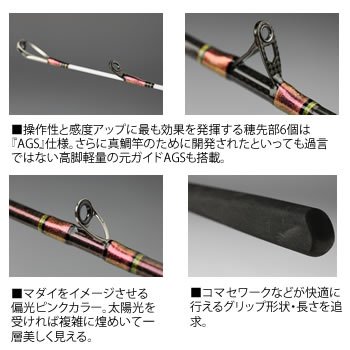 조작성과 감도 업에 가장 효과를 발휘하는 이삭 끝(칼·창·송곳·붓 등의 끝)부6개는[AGS]사양.한층 더 참돔간을 위해서 개발되다 해도 과언은 아닌 고각경량의 원가이드AGS도 탑재.