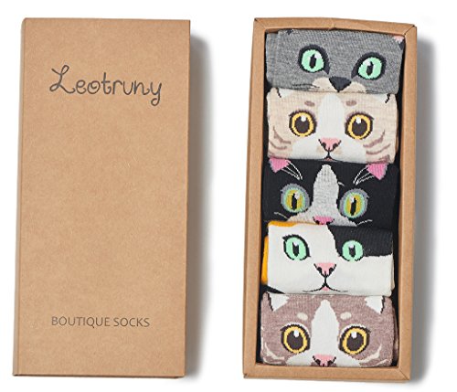 -. Binding : Apparel -. Brand : Leotruny -. ClothingSize : One Size -. Color : Multicoloured -. Department : womens -. Feature : Fit shoe size 6-9 (sock size 9-11) / Comfortable,Colorful and bright / Perfect gift for women in your life / Designed for comfort and style / 5 pairs of multicolors in Leotruny pack -. IsAdultProduct : 0 -. ProductGroup : Apparel -. ProductTypeName : SOCKSHOSIERY -. Size : One Size -. Title : Leotruny Women's Colorful Cute Cat Crew Socks with Gift Box