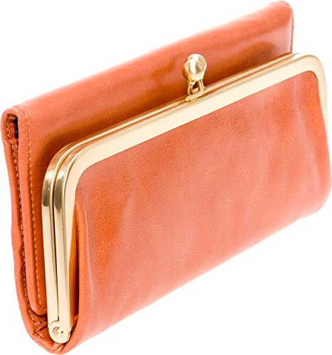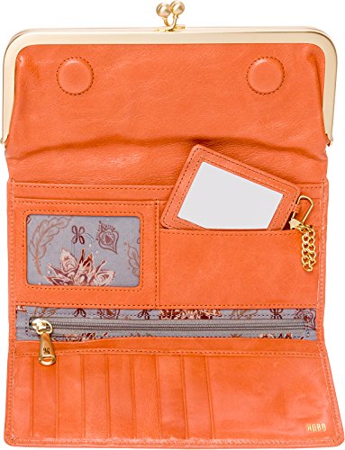 Superbly mixing class and function, this beautiful Rachel Clutch Wallet by Hobo transitions perfectly from day to night! Hobo is all about making stylish yet purposeful women's leather accessories and this wallet is no different. This clutch is made from top-grain leather which has been extra tumbled for a unique, broken-in vintage look and shine. This fully lined clutch has a large exterior pocket with a brushed finish metal kiss lock closure. The interior features 8 card slots, 3 currency pockets, 1 clear ID window, 1 zippered coin pocket, and a slip pocket with a cosmetic mirror. Show off your vintage style with this gorgeous clutch! Measures 8.25" x 3.75" x 1.5", folds out to 11.25" wide.Feature