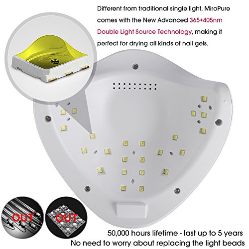 NEW LED LIGHT PROTECTS YOUR EYES & BODY: Your MiroPure UV LED nail lamp is equipped with 24 LED light beads which are different from traditional light bulbs. As the parent product, comparing with ultraviolet light of traditional nail lamps, the light is closer to white light, which ensures the color of nail gel and does no harm to your eyes as well as protects your skin from being black. Magnetic reflective panel can be separated without tools, more convenient for toenail gel curing.