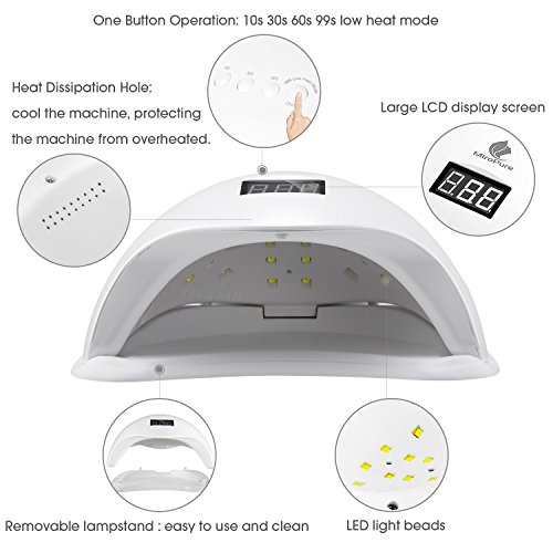 4 TIMER SETTINGS & HEAT DISSIPATION HOLE DESIGN: Your UV LED nail dryer has 4 timer settings:10s, 30s, 60s and 99s. During the 99s temperature gradually increasing mode, power enhances gradually to resolve all pain problems caused by curing gels. Also, heat dissipation hole design can cool the machine continuously for 30 seconds, protecting the machine from overheated.