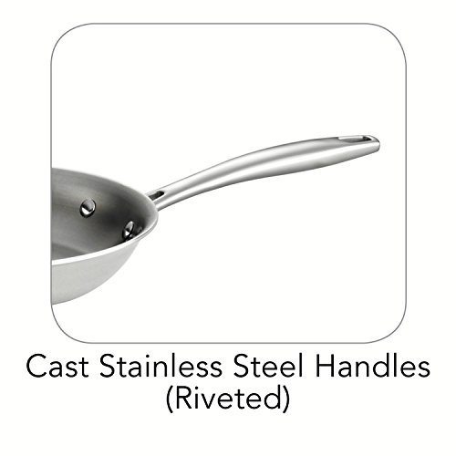 Tri-Ply clad construction (18/10 stainless steel, aluminum core, magnetic stainless steel) for quick and even heat distribution, without hotspots