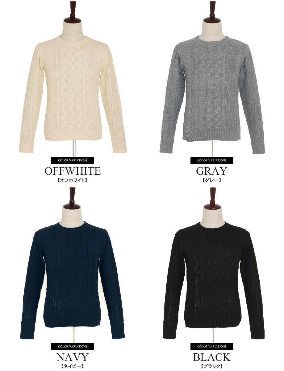 定番人気のケーブル編みクルーネックニット。ミディアムウエイトの5ゲージ仕上げで秋口は一着で冬場はインナー使いに丁度良いアイテム。空気を包み込むソフトな暖かさが秋冬シーズンに活躍度の高いトップスです。安定感あるカラー展開で着こなしやすいニット。