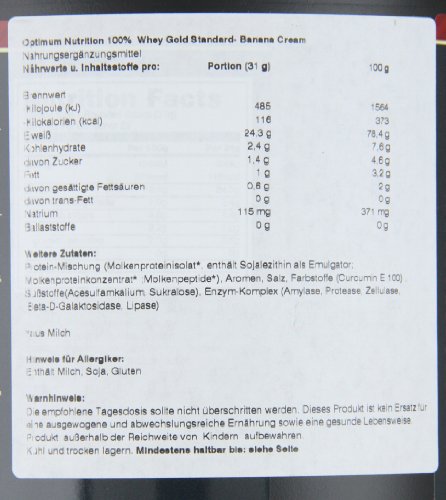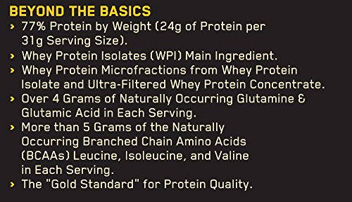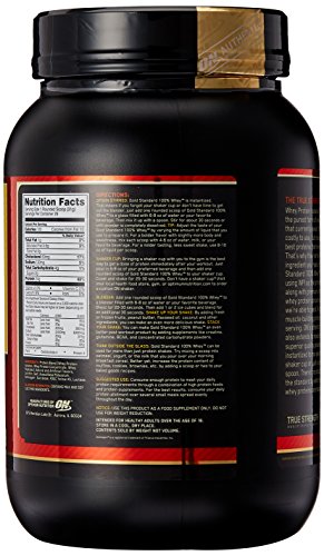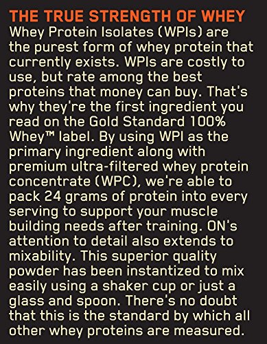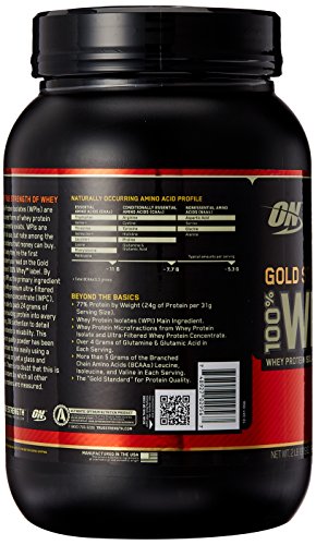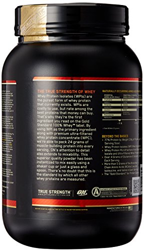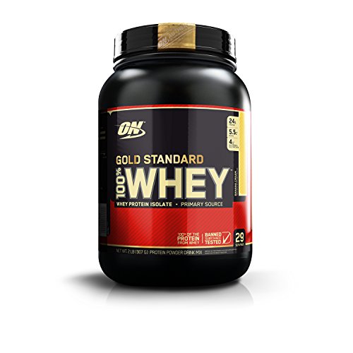 ReleaseDate : 2008-03-10 Studio : Optimum Nutrition Publisher : Optimum Nutrition Binding : Grocery Product Description Optimum Nutrition's Gold Standard 100% Whey uses pure Whey Protein Isolates as the primary ingredient. Combined with ultra-filtered whey protein concentrate, each serving provides 24 grams of all-whey protein and 5.5 grams of naturally occurring Branched Chain Amino Acids (BCAAs) which are prized by athletes for their muscle building qualities. With more than 20 tempting flavors to choose from, ON’s Gold Standard 100% Whey gives you plenty of ways to keep workout recovery interesting. 0