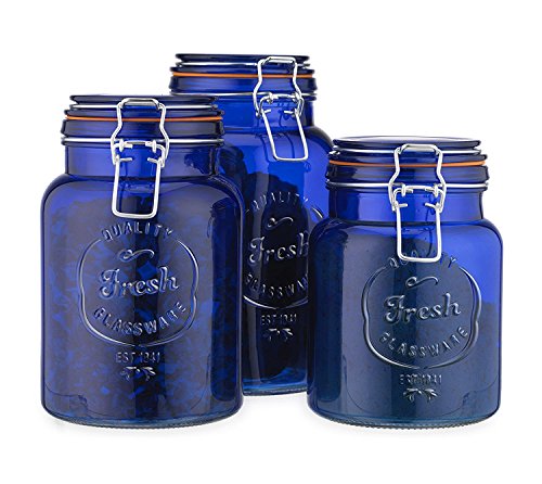 - Fresh Canister Set Of 3 Blue Glass Round Jar with Hermetic Seal bail & Trigger Lids for Kitchen - Food Storage Containers