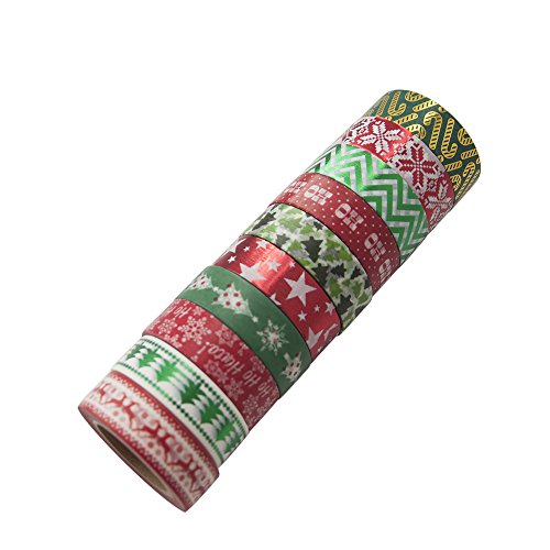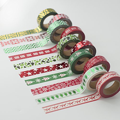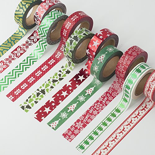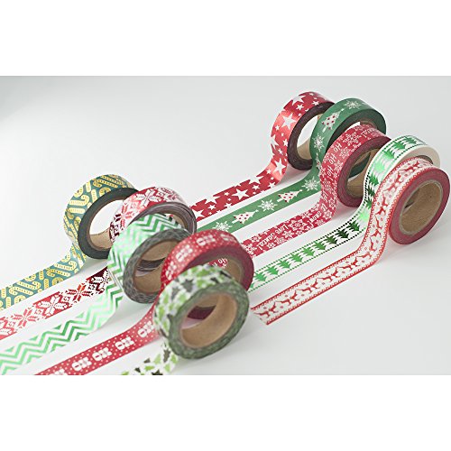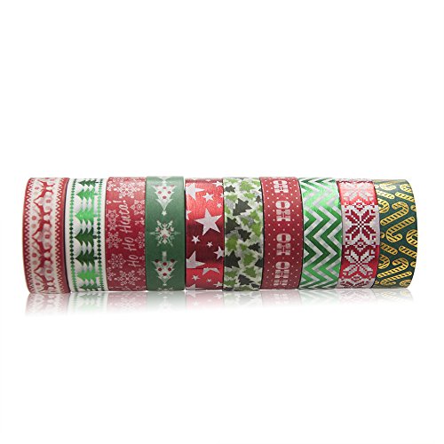 10 Rolls Christmas Washi Masking Tape Set Decorative Tape for Xmas Decorations, Scrapbooking, Craft Projects and Gift Wrapping, Total 330 Feet
