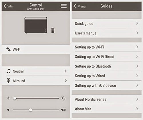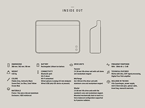 -. Feature : VIFA: Offers Internationally Recognized Award-Winning Nordic Design / TECHNICAL FEATURES: DSP signal processing, PurePathTM digital amplifiers, Vifa neodymium magnet drivers, force-balanced woofers. Works with Apple AirPlay, DLNA and includes optical cable. / CONNECTIVITY: Bluetooth aptX, Wi-Fi direct, Wi-Fi networked, Wired optical or analog (3.5mm minijack,) Wired USB (only iOS at present) / SPECIFICATIONS: One piece die-cast aluminum frame, ABS reinforced enclosure. Weight: 4.65 kilograms / 10.25 pounds. Dimensions: 268mm, 362mm, 90mm / 10.55in, 14.25in, 3.54in. / WARRANTY: Register for three year warranty