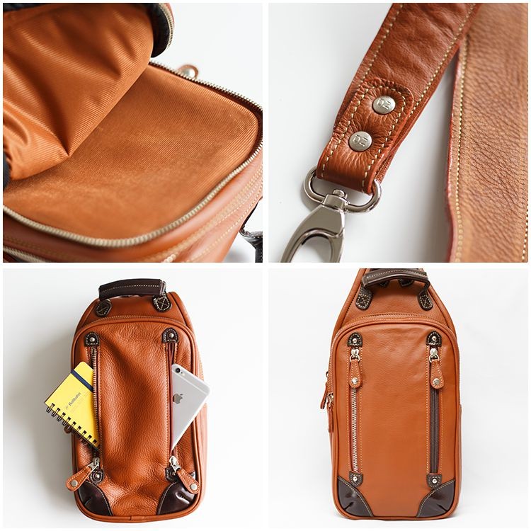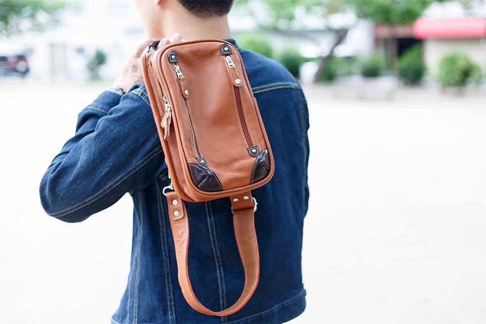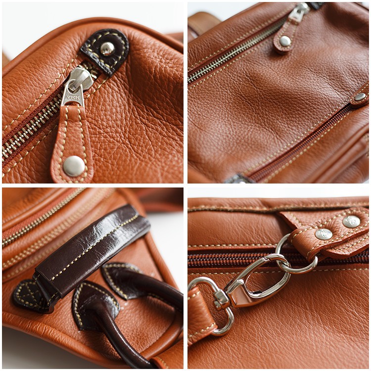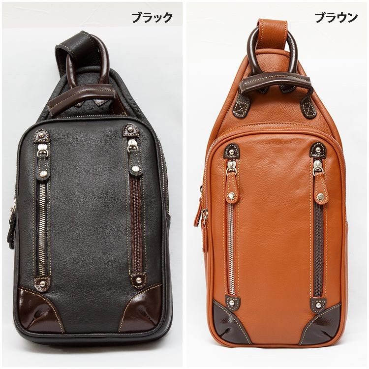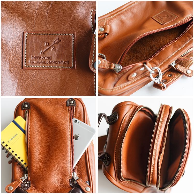 高級皮革素材シュリンオイルレザーを使用しています。前面に材質の違う2つのファスナーポケットがあります。大きく開口する、ラウンドファスナーのダブルポケット。上部には、手提げ用のベルトが施されています。手作り感溢れる本革ショルダーボディバッグ!普段持ち歩く財布、スマートフォン、車のキーや手帳等の小物を収納してスタイリッシュに持ち運びできます。シンプルマインドに可愛さと大人の高級感を表現しており、使い込むほどに深まるレザーの味わいを楽しめます。【本体】高さ38cm × 横幅18cm × マチ5.5cm【フロントポケット】高さ17cm【本体収納】幅18cm × 深さ28cmマチ(1層目)4cmマチ(2層目)1.5cm【背面ファスナーポケット】高さ19.5cm【ショルダー紐】幅3.8cm【素材】牛革(シュリンクオイルレザー)一部ポリエステル【カラー】ブラウン / ブラック