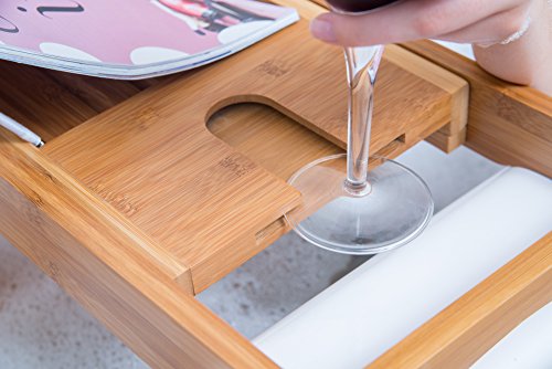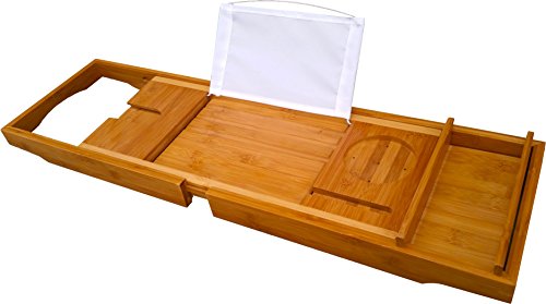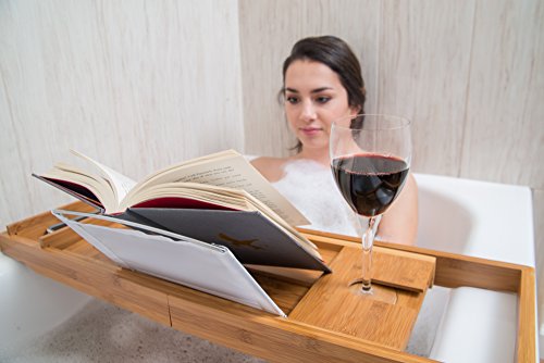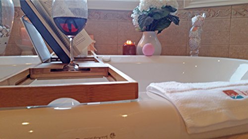SIT BACK & RELAX: Enjoy a hot, soothing bath with a glass of wine and catch up on your newest books, movies or shows. Fully adjustable up to 43.5”, measured to fit any sized bath tub. Includes towel and soap accessories holder
