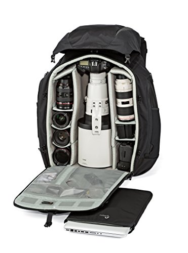 Fits 2-3 Pro DSLRs, one with up to 600mm f/4.0 lens attached, 5-7 extra lenses, 2 flashes, tripod or monopod, up to a 15" laptop, accessories and personal gear