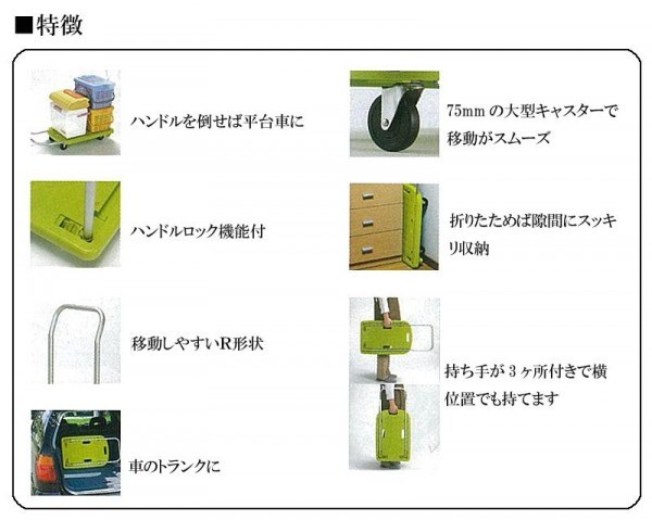 fk094igrjsキャンプや行楽などで大活躍!折りたたみもカンタンですサイズ(約)使用時:幅400×奥行620×高さ845mm、収納時:幅165×奥行400×高さ840mm個装サイズ:41×13×85cm重量(約)2.9kg個装重量:3200g素材・材質本体:ポリプロピレンハンドル:アルミニウム合金キャスター樹脂部:ポリ塩化ビニール金属部:鉄(亜鉛めっき)仕様耐荷重:約50kg製造国日本持ち運びらくらく超軽量!キャンプや行楽などで大活躍!折りたたみもカンタンです