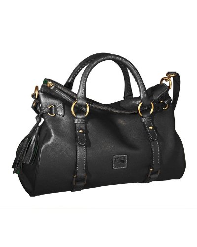 Dooney & Bourke Florentine Vachetta Satchel Black/Black Trim Med to LARGE in size approx 15"L x 9"H x 6" D. Dual rolled whip stitched handles and 16" L adj. strap. Lined, inside zip, slip, and cell pockets plus key clip. PLEASE ASK QUESTIONS AND READ FULL RETURN POLICY INCL. RESTOCK FEE PRIOR TO PURCHASEFeature