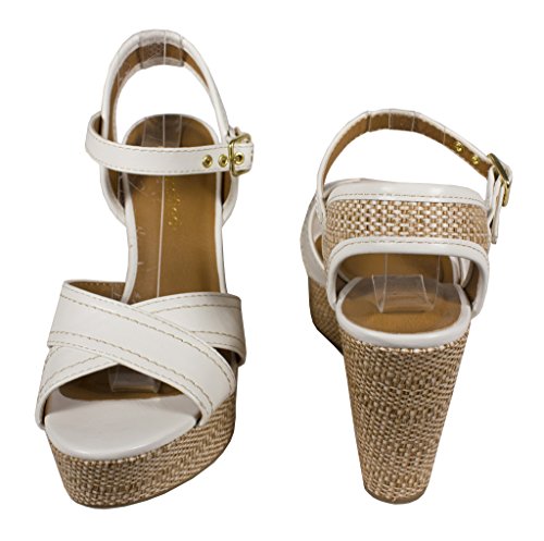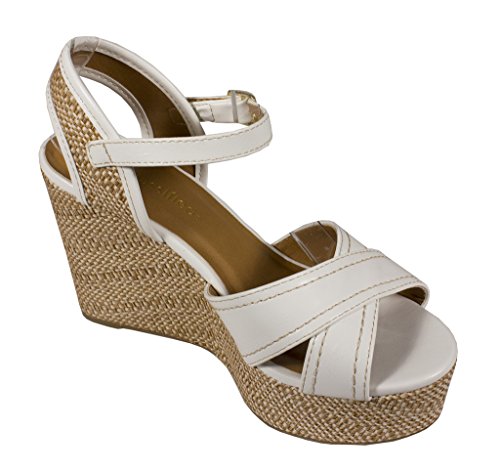 City Classified Women's Kimball Ankle Strao Platform Raffia Wedge Sandal in White Leatherette