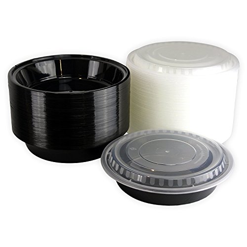 Round 48oz Plastic Microwaveable Food Containers (Black) w/ Clear Airtight Lids Pack of 50 - Microwave/Dishwasher Safe [ 9.2" x 1.7"]