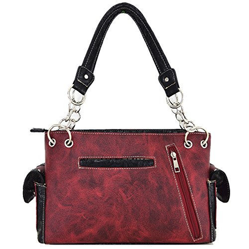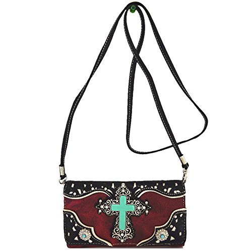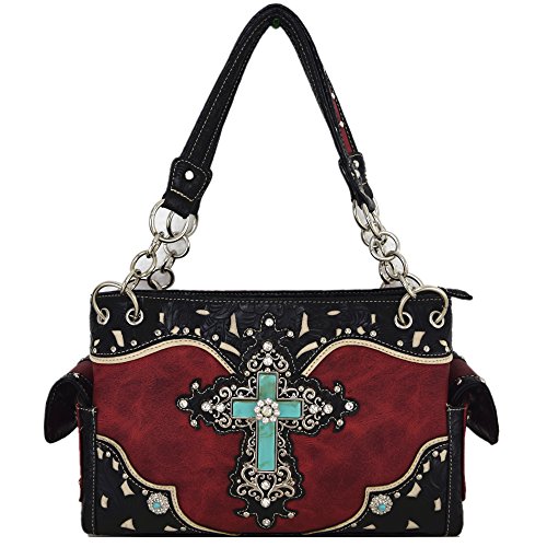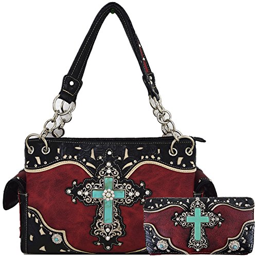 Western Rhinestone Cross Concealed Carry Handbag Tooled Leather Shoulder Bag Country Purse Wallet Set Red