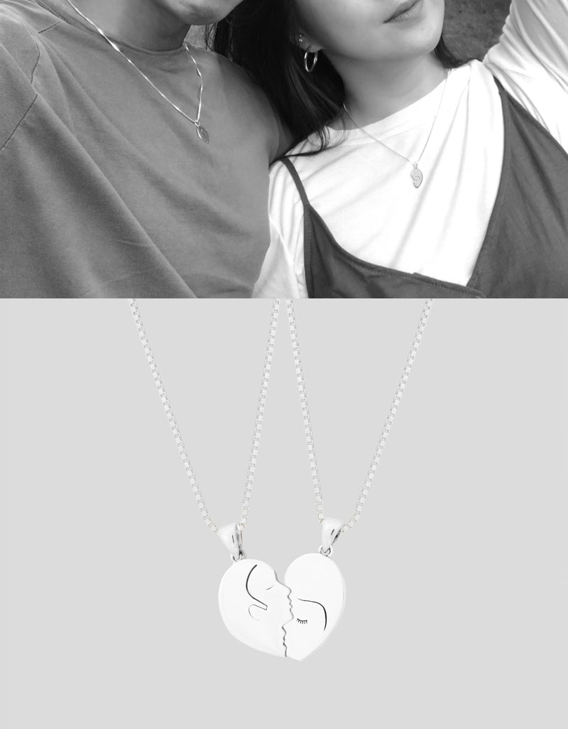 Heart series No.0705 하트시리즈 - 그녀를 얻기위한 키스 (Kiss ToGetHer) Silver 925 하트와 키스하는 연인의 모습을 표현한 감각적인 디자인입니다. 진정한 사랑은 연인이 함께 할 때 만들어지 듯 남녀 팬던트가 함께 서로에게 입맞춤할때 하트가 완성됩니다. 심플하면서도 미니멀한 라인 표현이 돋보이며, 유니크한 스타일의 커플목걸이를 원하시는 분들께 적극추천합니다.