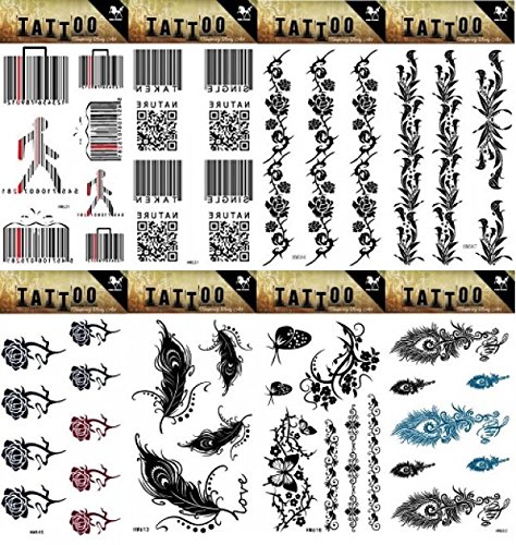 GGSELL GGSELL 8pcs different temporary tattoos designs in one package, it including barcode,black flowers,roses,butterflies,feather tattoo stickers