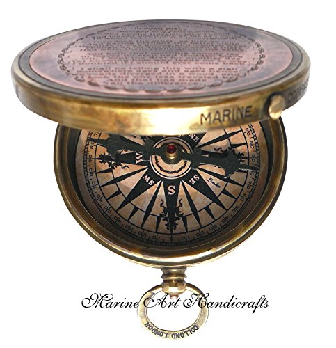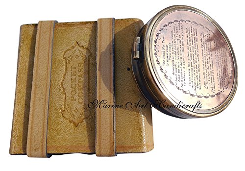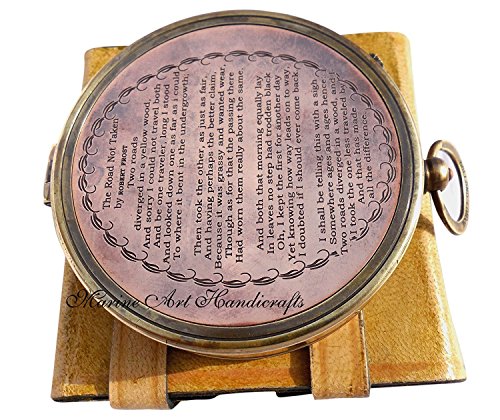 Studio : NAUTICALMART INC Publisher : NAUTICALMART INC Product Description Robert Frost Poem Engraved Brass Compass with Embossed Needle with Leather Case. Gift for some one you love. Engraved message of the Compass.The high quality jeweled compass needle settles to North very quickly for timely and accurate readings. 'The Road Not Taken Two roads diverged in a yellow wood, And sorry I could not travel both And be one traveler, long I stood And looked down one as far as I could To where it bent in the undergrowth; Then took the other, as just as fair, And having perhaps the better claim Because it was grassy and wanted wear, Though as for that the passing there Had worn them really about the same, And both that morning equally lay In leaves no step had trodden black. Oh, I marked the first for another day! Yet knowing how way leads on to way I doubted if I should ever come back. I shall be telling this with a sigh Somewhere ages and ages hence: Two roads diverged in a wood, and I, I took the one less traveled by, And that has made all the difference' Size:- 7cm - Dia x 2cm - Thick (Compass) Size:- 8.5cm - L x 3cm - H x 8.5 - W (Leather Case) Finish- Bronze Total Weight- 250 gms. 0