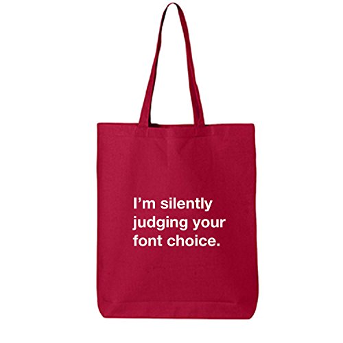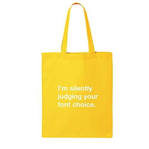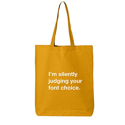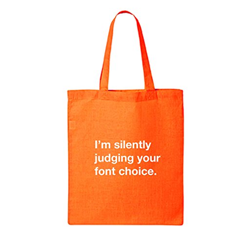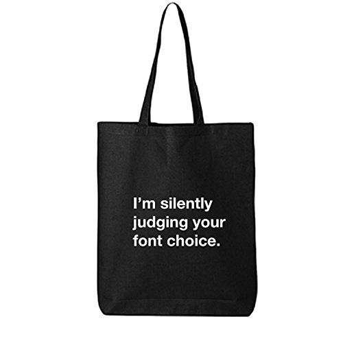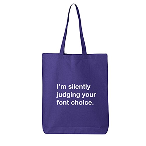 Product Description This cotton canvas tote bag features "I'm silently judging your font choice" on the front. 15" Wide x 16" High x 3" Deep with 20" handles. Printed in the USA on an imported bag. 0