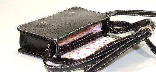 This compact Kate Spade cross-body is made of rigid textured black leather with polished silver tone hardware. There's contrasting top-stitch detailing throughout. Flap style bag with dual magnetic closures on the front, along with Kate Spade license plate logo. The interior is lined in custom Kate Spade cream printed fabric. It has a single, adjustable shoulder / cross-body strap that has a drop of about 19.5" to 21.5". Measures approximately 7.5" (L) x 4.5" (H) x 2" (W).Feature